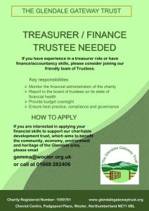 I joined the Glendale Gateway Trust in August 2021 and took over the accounts when my predecessor retired in September 2022. I have worked in finance since leaving school. I have previously lived in Dorset, Germany and the Isle of Man, before settling in Wooler in April 2021.